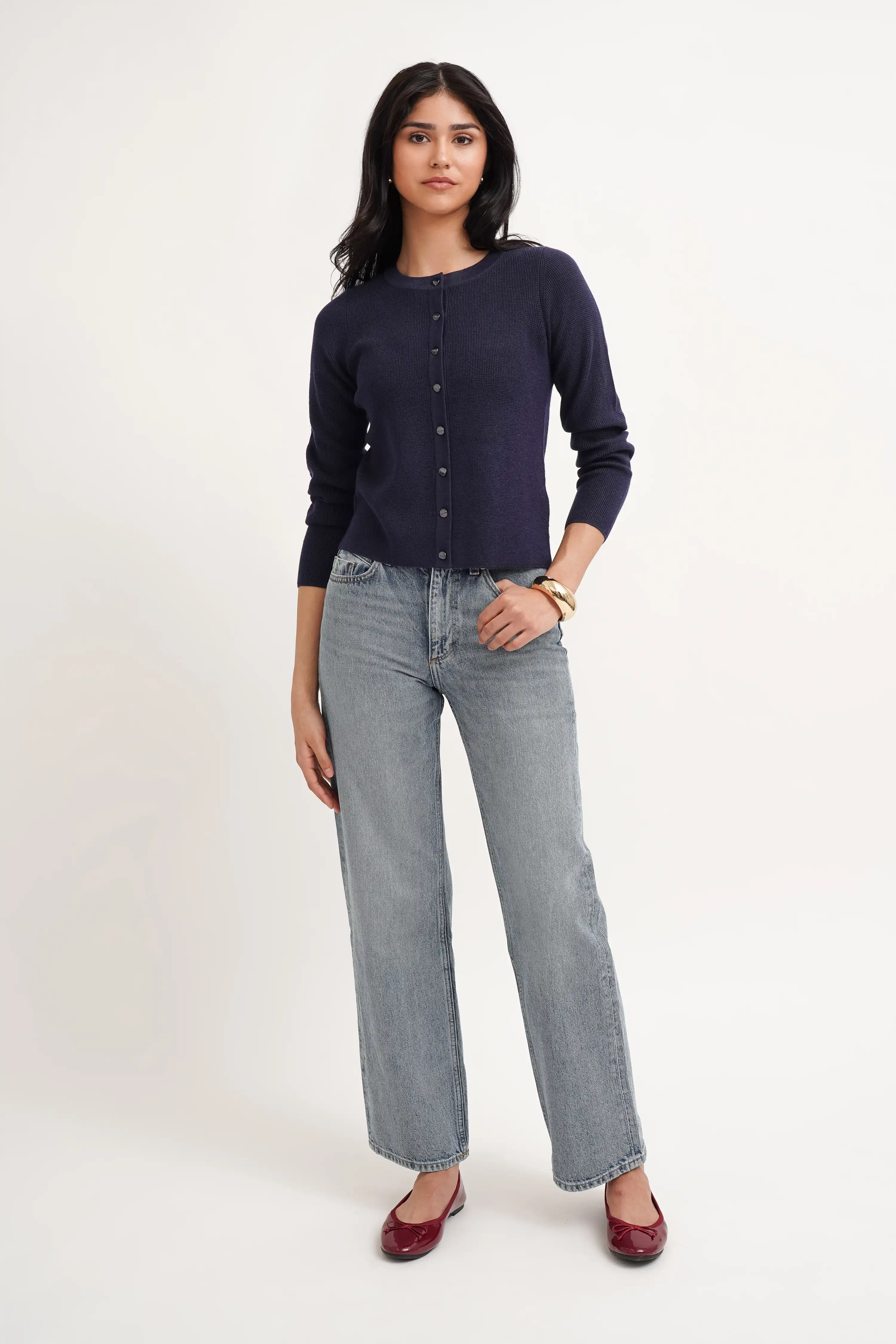 This is the kind of cardigan you’ll reach for without even thinking. Light, soft, and easy to style, it layers perfectly over tanks and tees while still looking polished on its own. The delicate texture and tonal buttons give it just enough detail to feel special—simple, feminine, and endlessly wearable.