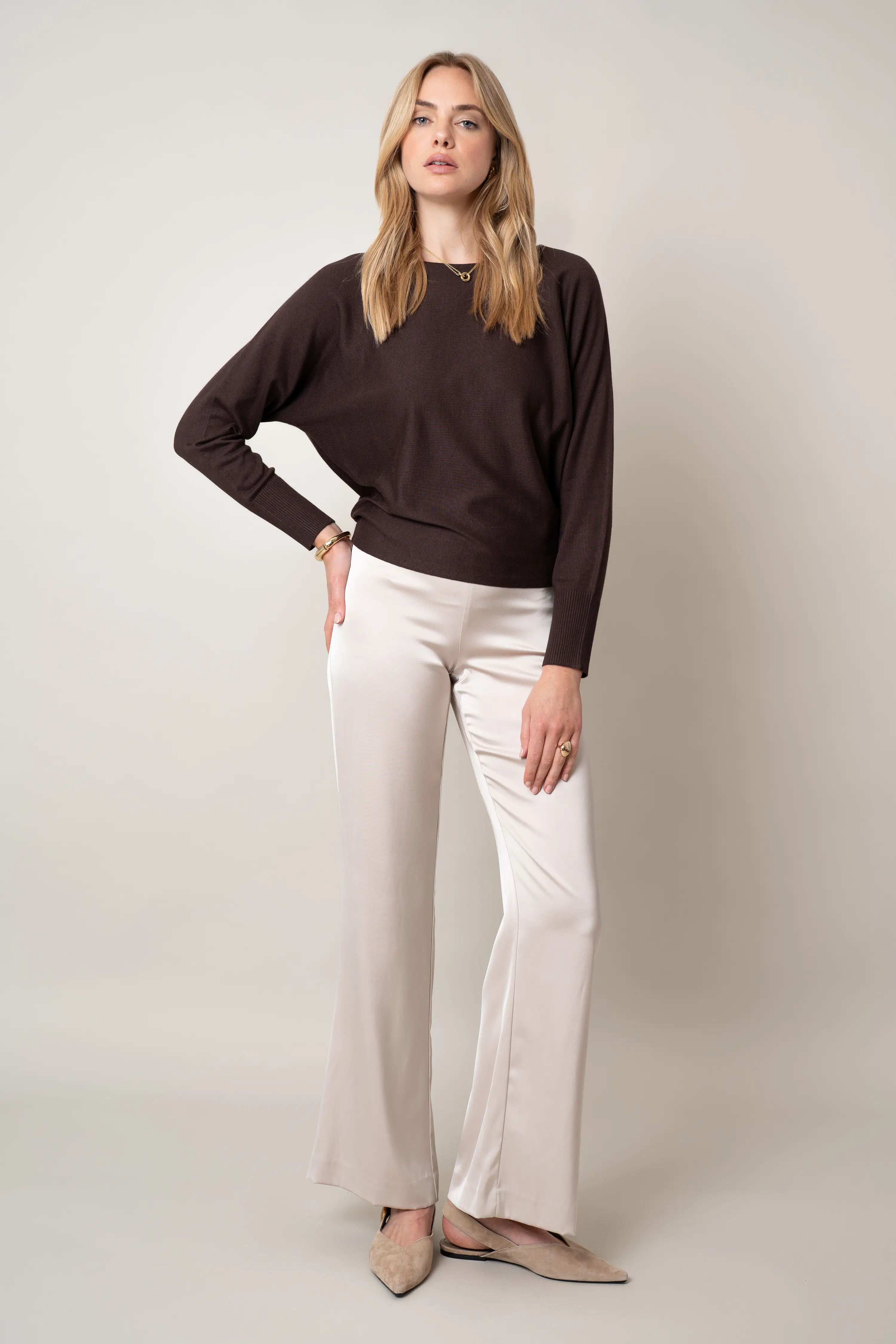 Clean and easy, this lightweight pullover brings subtle elegance to everyday wear. A boat neckline and softly draped dolman sleeves that taper to a slim forearm balance the relaxed silhouette, making it an easy piece for tucking, layering, or wearing as is.